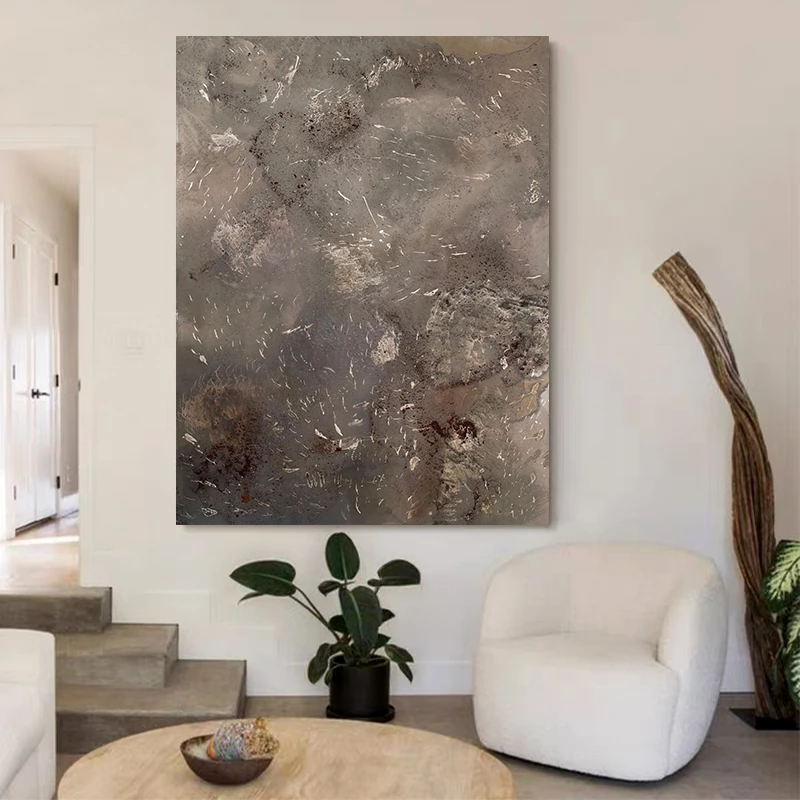 MUMO.オリジナル手描き《シルバーグラベル》リビングルーム用シンプルテクスチャアートワーク、寝室の装飾画、抽象壁画でお部屋をスタイリッシュに演出!